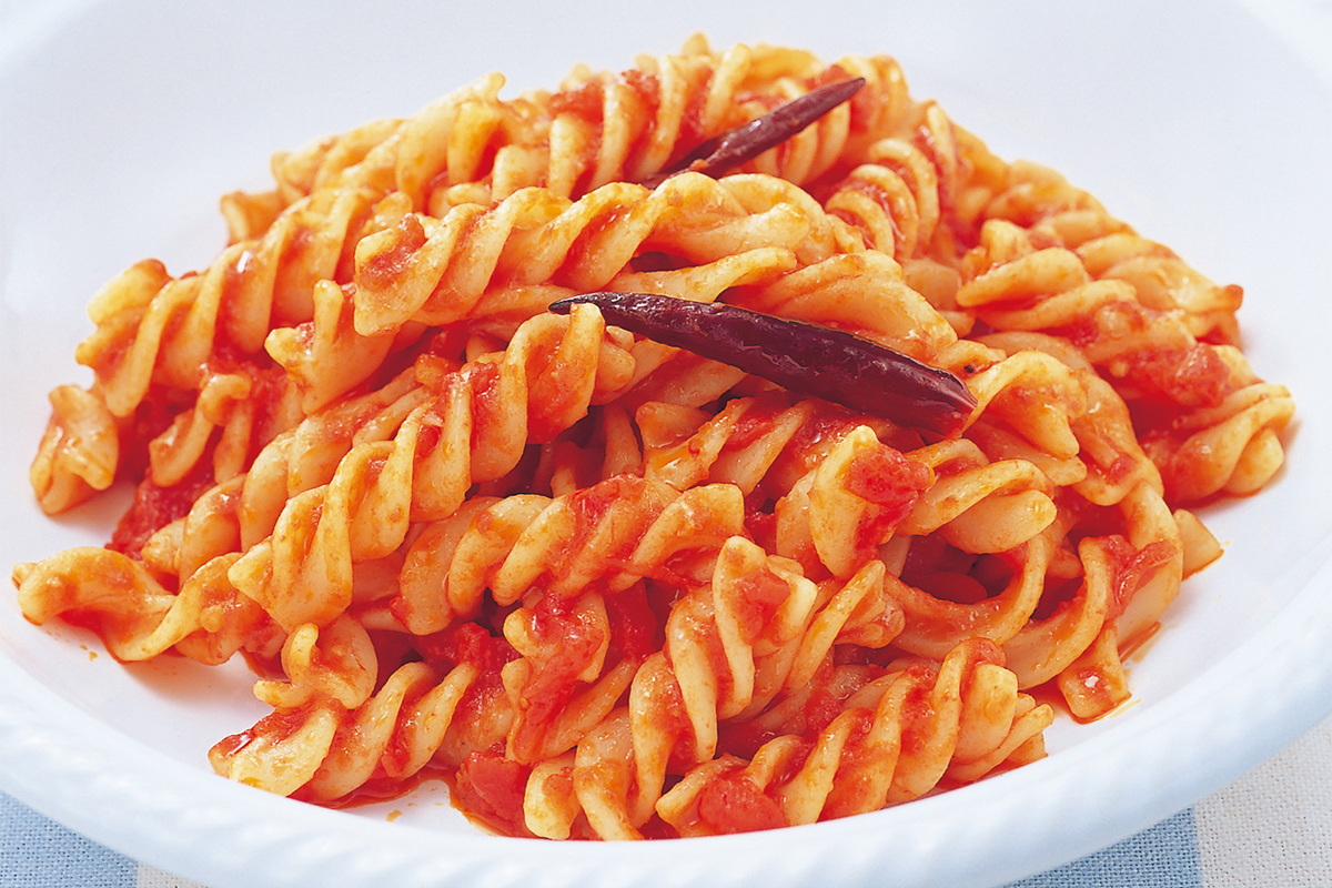 イタリア中部ラツィオ州(首都ローマのある州)が発祥の地で、唐辛子を利かせた濃厚なトマトソースがなんとも最高❗スパゲッティの他、ペンネやフジッリなどのショートパスタにもよく合います。